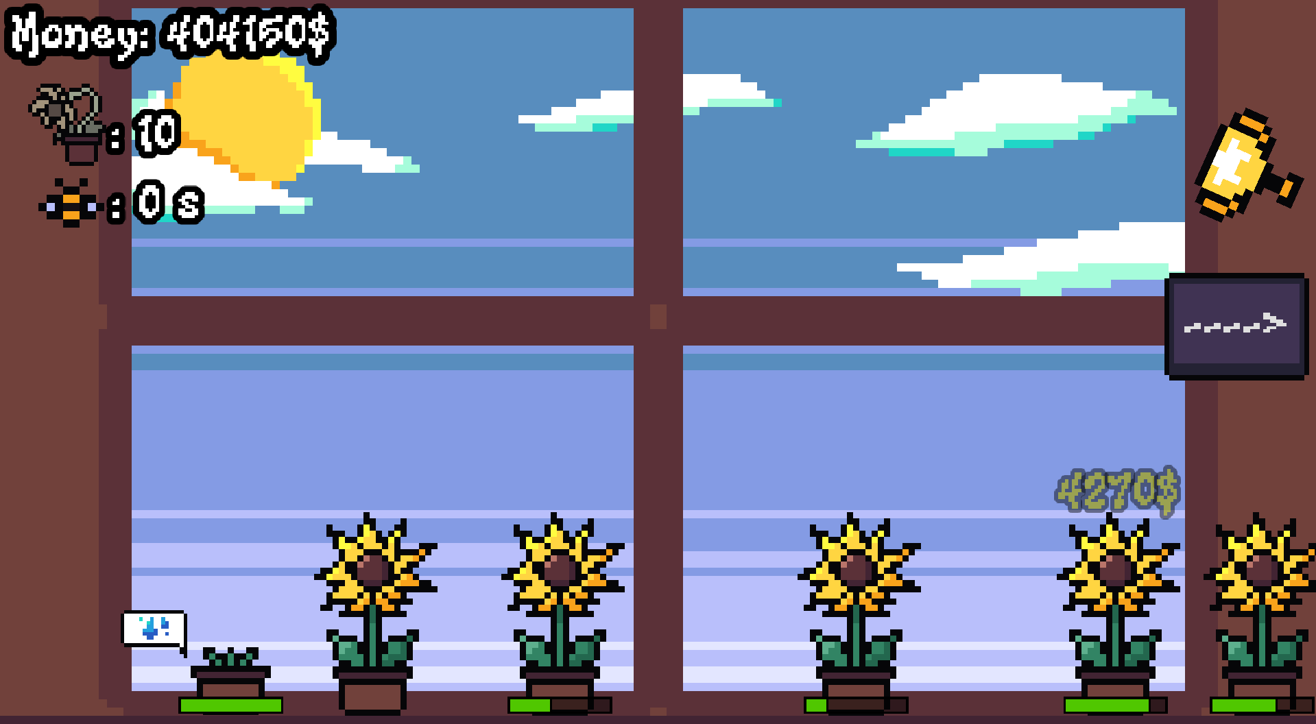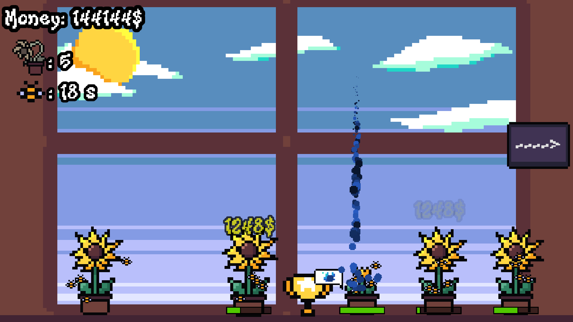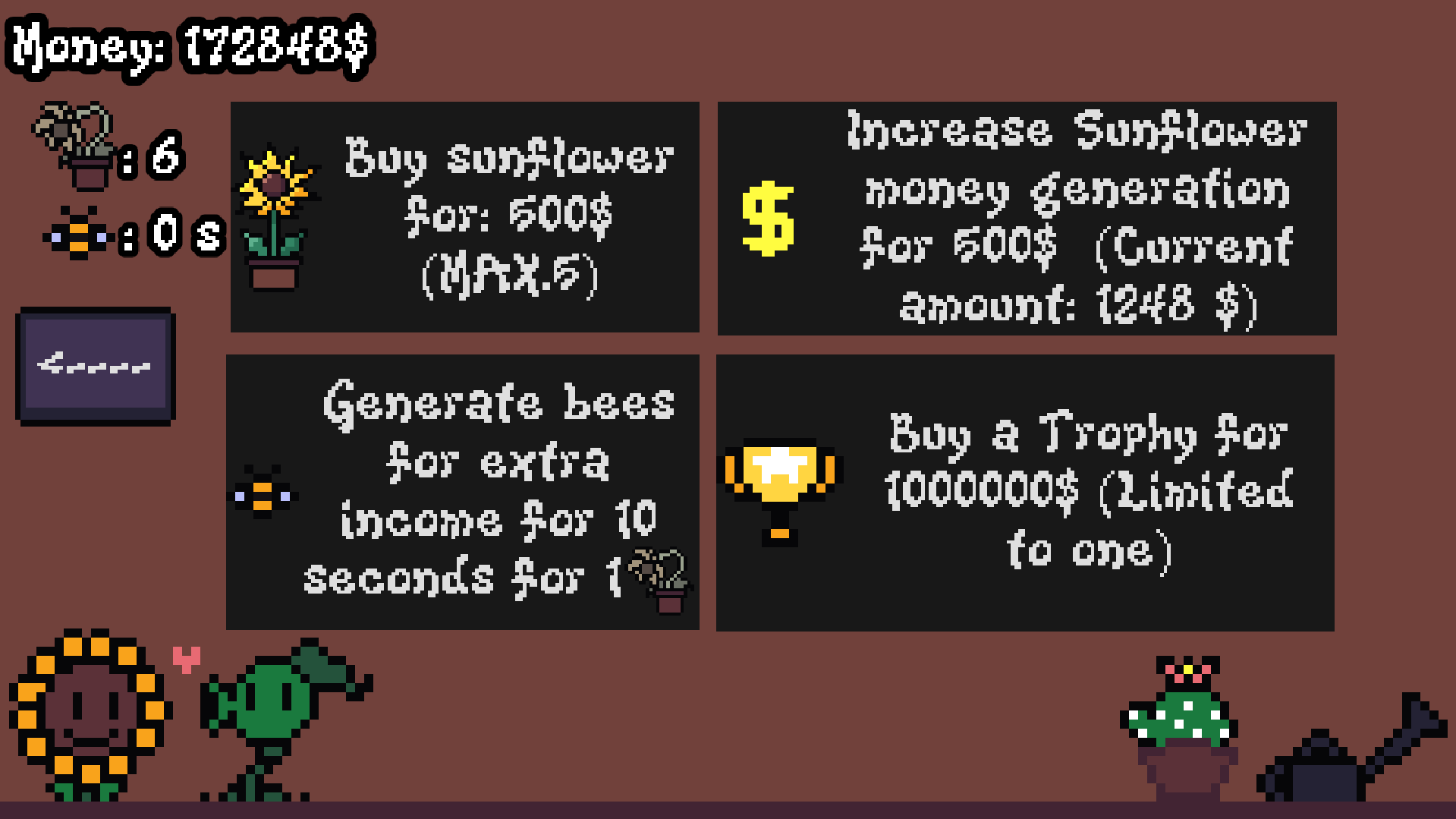 Hold left click over flowers to water them! Make money to eventually get the Trophy:)